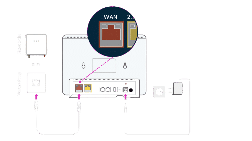 i vægudtaget/fiberboksen. Kontroller at routeren er tilsluttet det korrekte vægudtag og den korrekte port hvis du har en fiberboks. Sørg også for, at strømforsyningskablet er tilsluttet udstyret og at dioderne lyser.